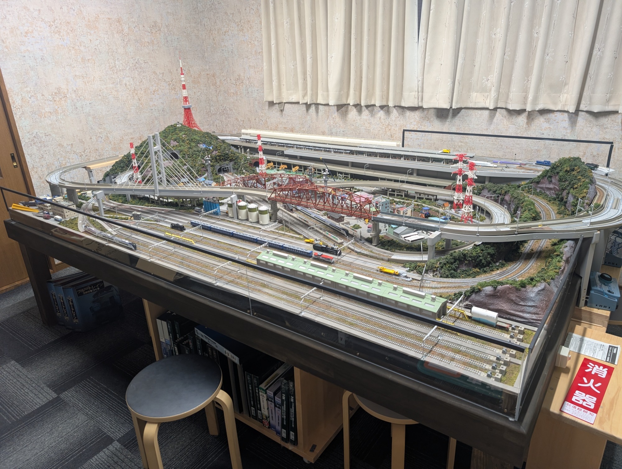 ショールーム奥にNゲージ展示しております♪自作ジオラマを含め迫力ありますので是非お気軽にお越しください。